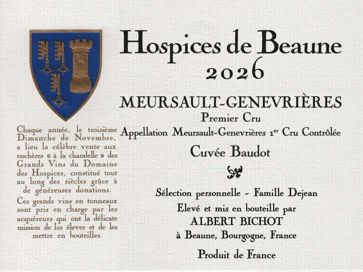 Reconnaissable entre toutes, l’étiquette des Hospices de Beaune fait partie du patrimoine bourguignon. Elle arbore les armoiries familiales des fondateurs Nicolas Rolin et Guigone de Salins, l’appellation et le nom de la cuvée, le millésime et bien entendu le nom de notre maison Albert Bichot en charge de son élevage en votre nom.