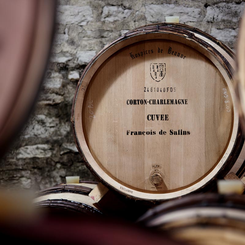 This Corton Charlemagne Grand Cru Cuvée François de Salins has been skilfully vinified by the Domaine des Hospices de Beaune. Sold every year at the Hospices auction on the 3rd Sunday in November, Albert Bichot regularly buys this great wine on behalf of clients who then entrust us with its ageing in our cellars. During this important period, thanks to meticulous work and the blending of a variety of barrels, we further develop its complexity and potential.