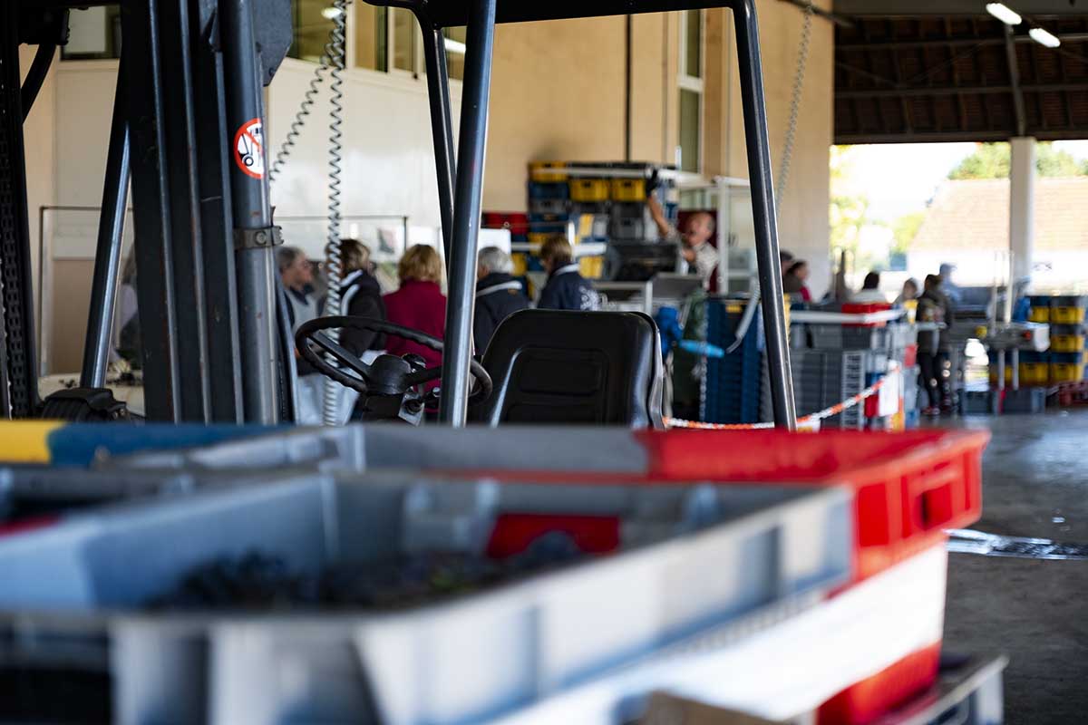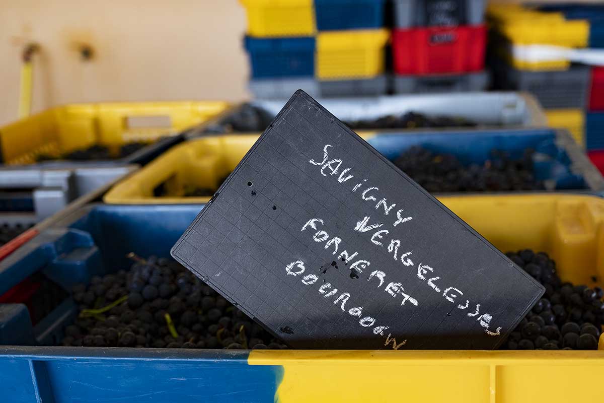 At first the southernmost parcel: Pouilly Fuissé but at the same time as the Volnay 1er Cru Santenots, and also a still early sector of Beaune, around Les Avaux. Then everything came together, with a short break when it rained heavily on September 19/20, even though we harvested in the afternoons. Then we finished, because it was time to go and pick our grapes. The harvest was over, so it was the right time.