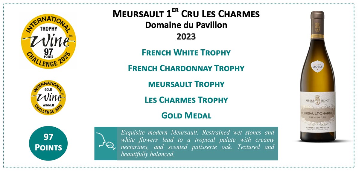 Cette année, notre maison a également été récompensée pour d'autres vins des Hospices ou de nos Domaines. Notamment notre Meursault 1er Cru Les Charmes Domaine du Pavillon 2023 a reçu les titres suivants : French White Trophy, French Chardonnay Trophy, Meursault Trophy, Les Charmes Trophy, Gold Medal.